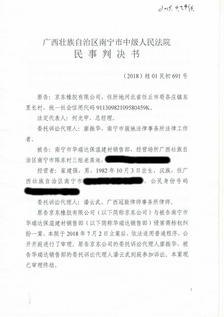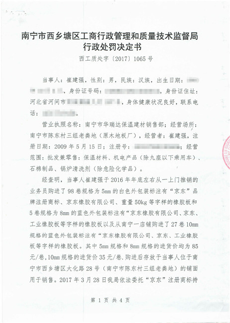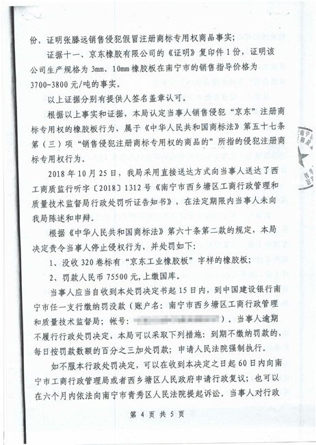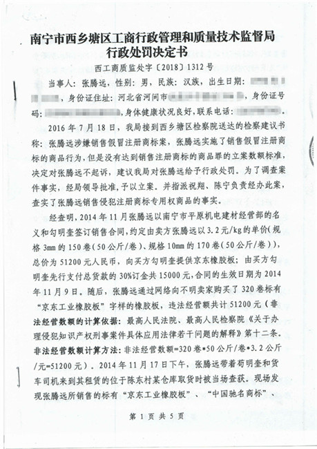 截止到2018年11月份,廣西南寧西鄉塘區工商行政管理和質量技術監督局對假冒我公司商標侵權行為進行行政處罰:崔建強[西工質處字(2017)1065號] 10000元;張騰遠[西工商質監處字(2018)1312號] 75500元。全部上繳國庫。并對這兩起案件我公司也進行了司法賠償判決。